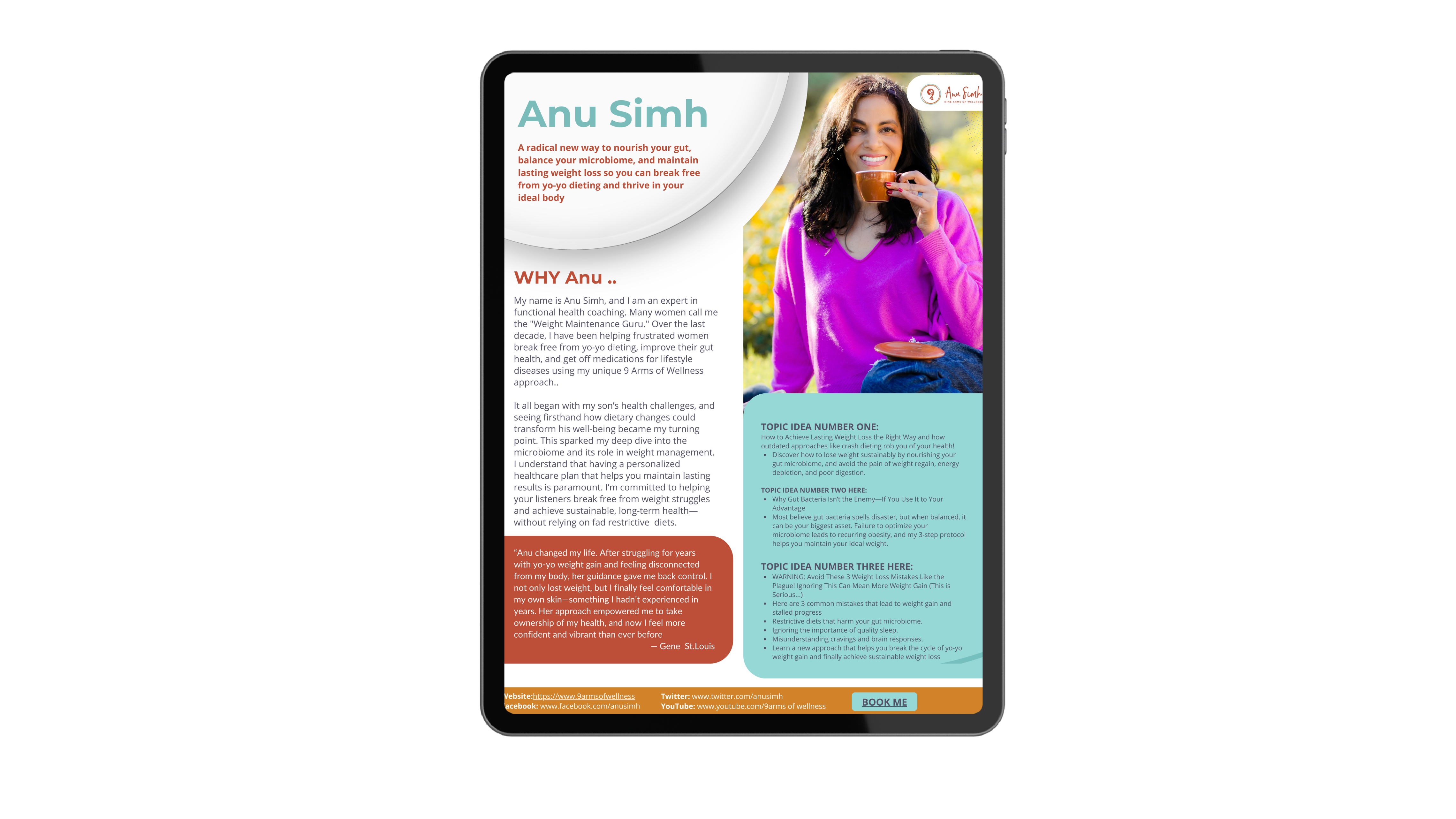 Anu Simh is a board-certified functional health coach, Ayurvedic counselor, and founder of 9 Arms of Wellness, a comprehensive health philosophy that addresses gut health, brain responses, and sleep disruption. Her personal experiences with gut issues, and lack of energy inspired her to develop a proprietary protocol helping busy women break free from yo-yo weight gain.